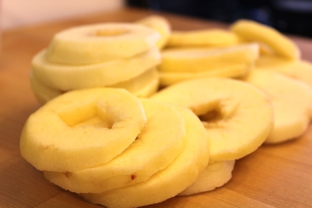 Then, cut into approximately 1/2-inch slices – for me each apple gave me about 6 slices.