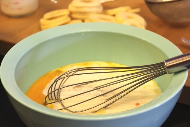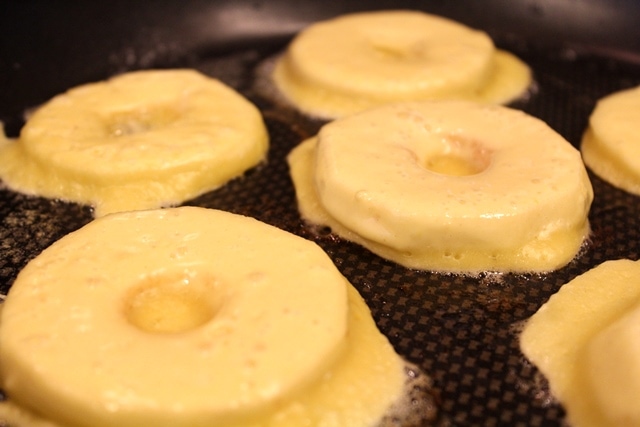 The recipe is a simple crepe-style dough in which you dip whole apple slices, then cook them.