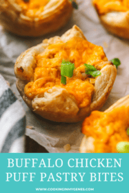 I love appetizer dips like my Easy Cheesy Baked Pizza Dip and Cheesy Baked Pesto and Sun-Dried Tomato Dip for game day eats. And, while I enjoy buffalo chicken dips, these puff pastry appetizers are a fun new way to enjoy the same spicy chicken flavours! They’re like little buffalo chicken puff pastry pockets that are perfect for sharing and enjoying on game day.