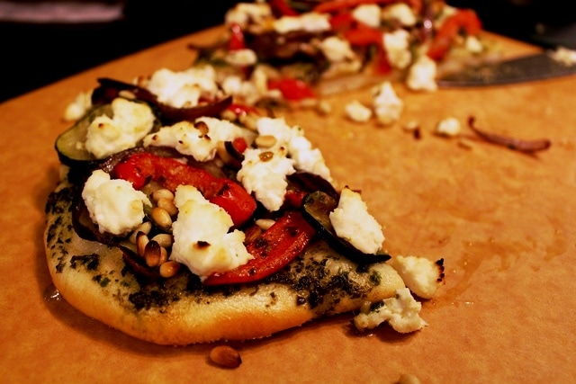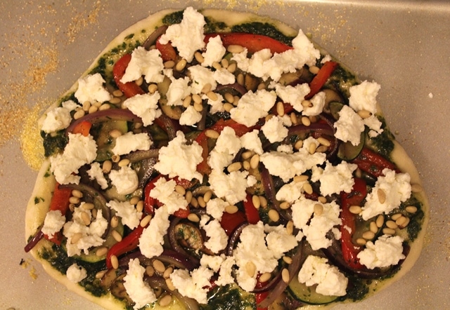 Use the pesto as the base, as much or little as you want spread out onto the dough. Then, spread out the vegetables and top with ricotta and pine nuts.
