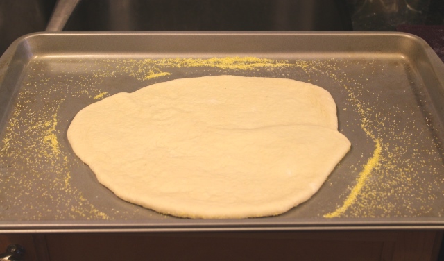 Next, heat the oven to 425F and then roll out the pizza dough. Put a bit of cornmeal on a cookie sheet, place your pizza dough on the pan and then dress your pizza.