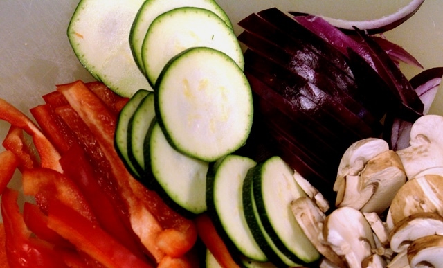 Slice the zucchini, red pepper, mushrooms and red onion.