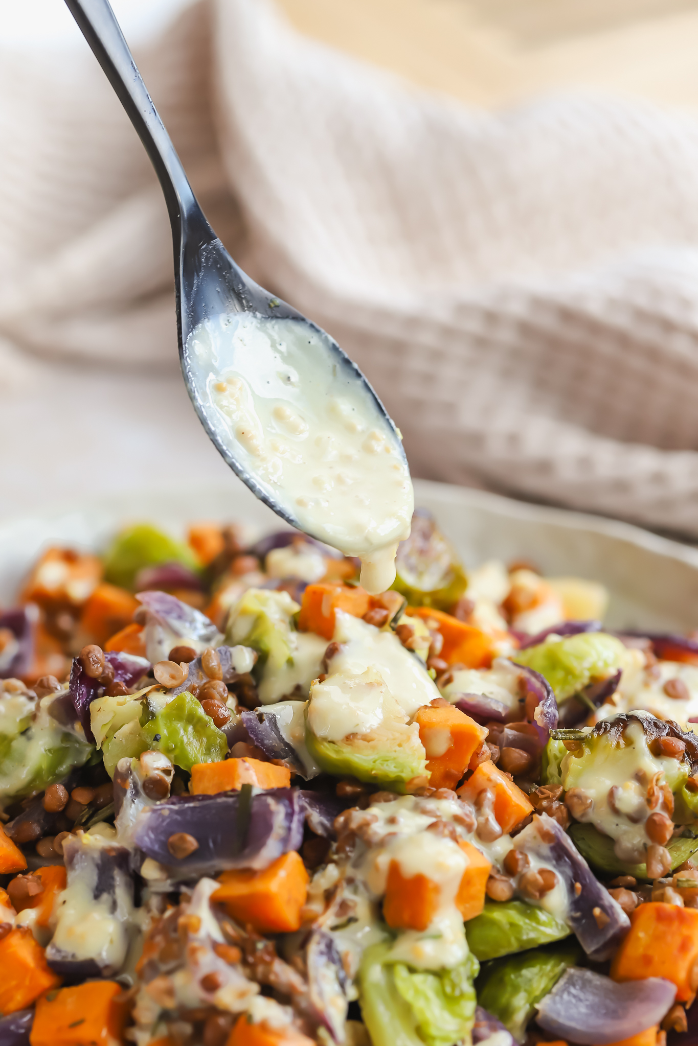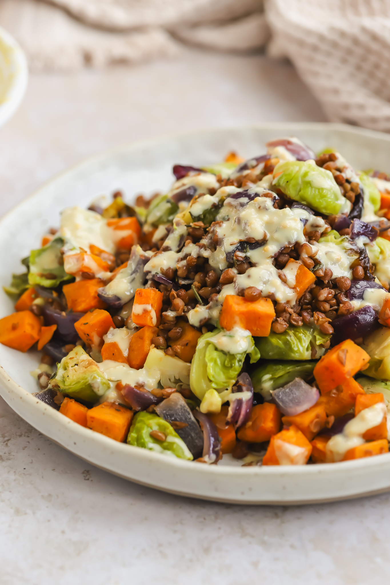Roasted sweet potato, brussels sprouts, red onion and warm lentils are topped with the most divine Maple Mustard Tahini Dressing.